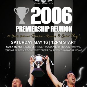 On the day, our current teams take on Templestowe and it is priced at $20 per ticket which includes finger food, a drink on arrival & of course – reminiscing on incredible memories from our triumph from two decades ago!
