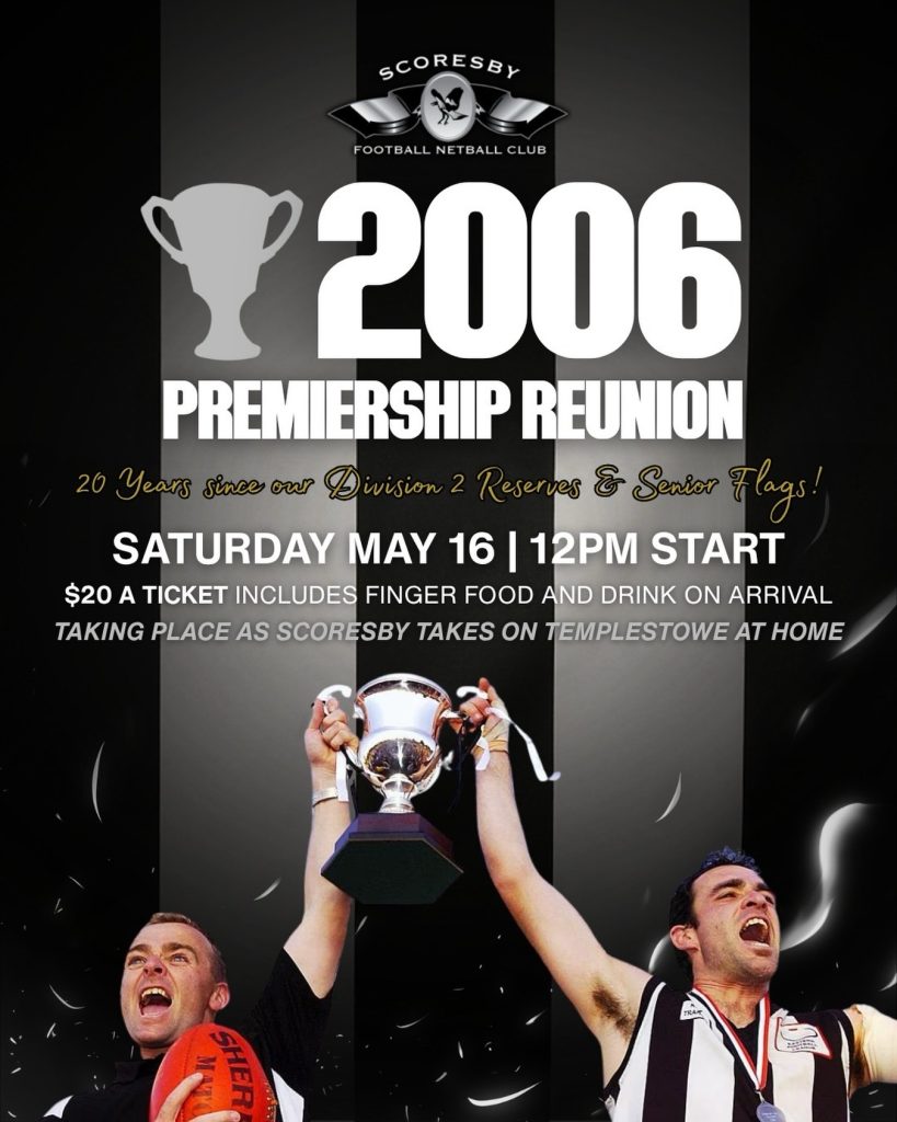 On Saturday May 16, we welcome all past players, supporters, volunteers, coaches and everyone involved with our 2006 Reserves + Seniors Division 2 Premierships to come on down for the 20 Year Reunion.
