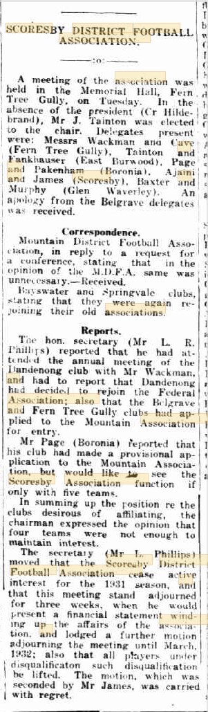 • 1931-Early in 1931 a number of meetings were held in relation to the upcoming Football season. It was the general opinion that a five team competition was not viable. Four of the clubs had indicated that they would join either the ‘Ringwood’ or ‘Mountain’ Leagues which ended the ‘Scoresby’ Association.We suspect that the Club and probably others around at the time were finding it impossible to continue due to in the main, the Great Depression. Some severe floods which ruined crops in 1929/30 did not help either.