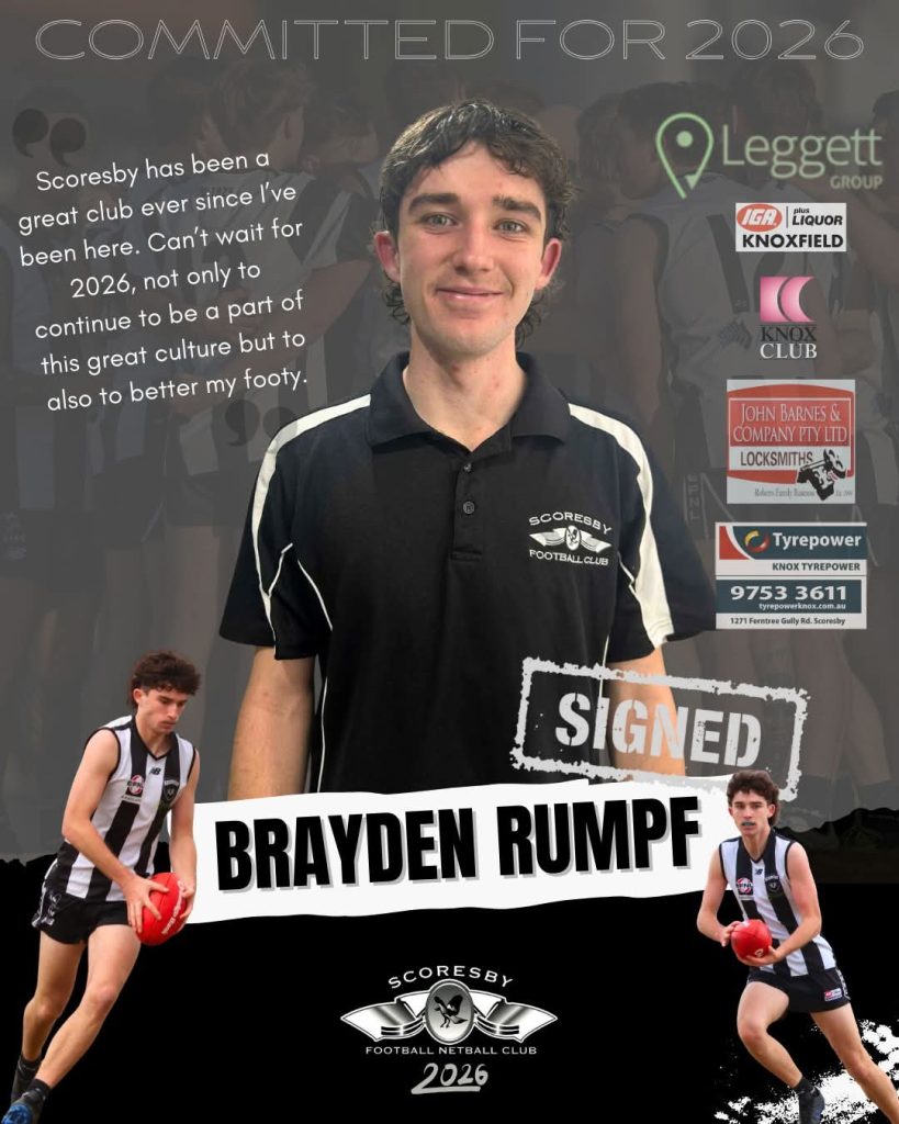 We are delighted to announce that Brayden Rumpf has signed on to play for Scoresby in 2026. At the conclusion of the 2023 season, Brayden transferred from Lysterfield Wolves Junior Football Club and has made impressive growth. As a footballer, his defensive skills have been on display week after week, but as a leader, Brayden has shone as a captain of the Division 3 Under 19 team in 2025. As a club, we take in our development program and Brayden is forging a path for others to transfer out of the 19s program into Senior footy. Amazing work, Brayden!